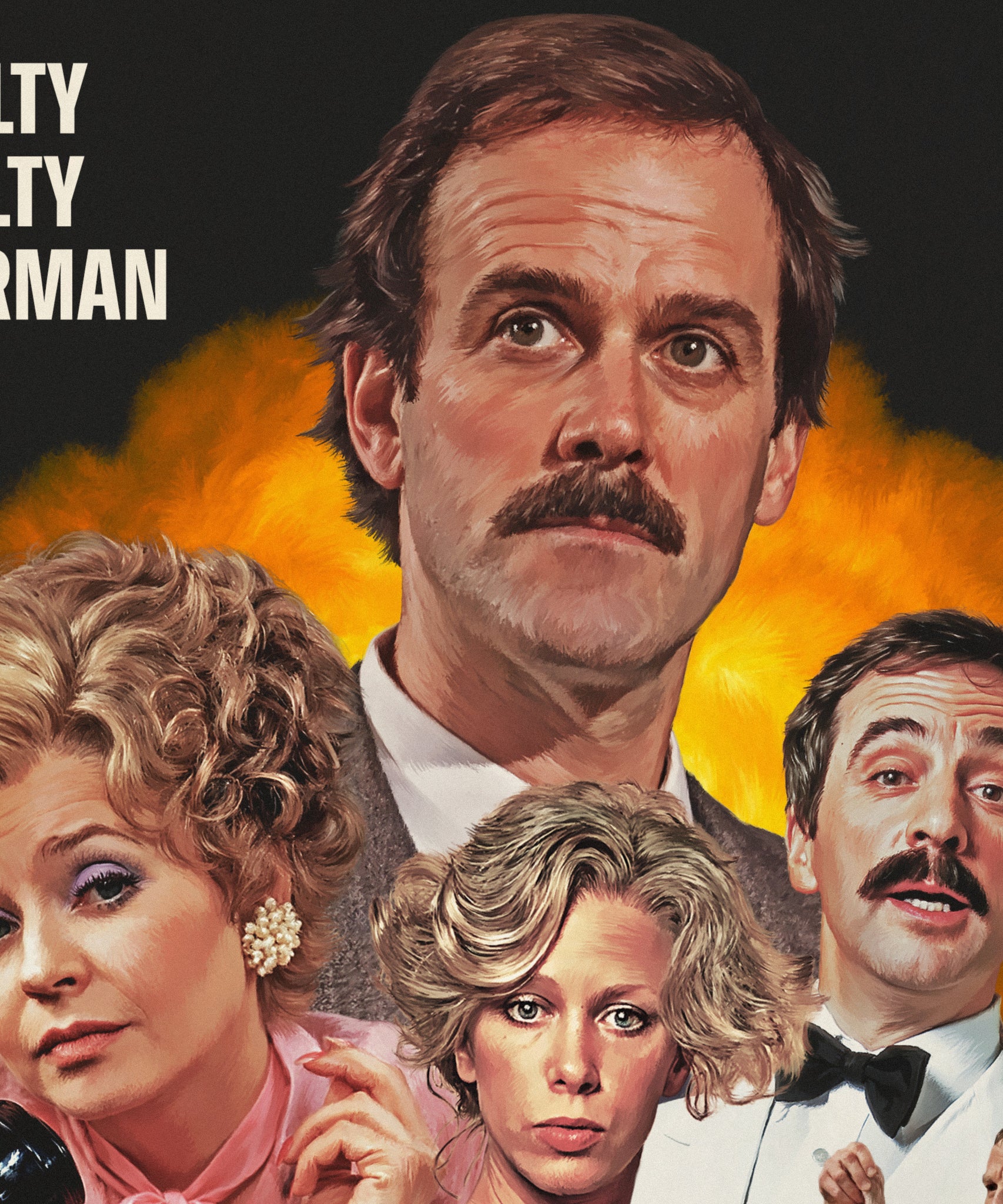 This illustrated print reimagines Fawlty Towers as a classic 60s/70s theatrical release — featuring Basil, Sybil, Polly, Manuel and the unforgettable chaos of Torquay’s most dysfunctional hotel.